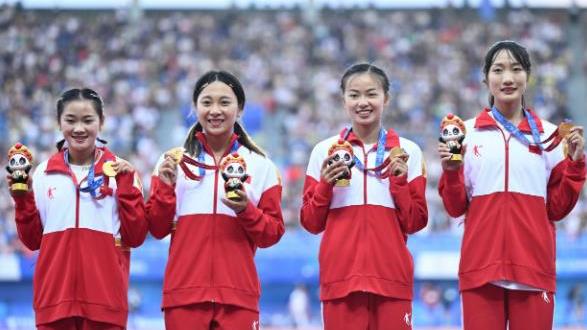 中国体育报成都8月6日电 8月6日晚,中国选手在短短5分钟内先后夺得成都世界大运会田径男子和女子4×100米接力跑的两枚金牌,被夏雨浇湿的双流体育中心体育场上万名观众手舞“中国红”一次又一次欢呼雀跃。