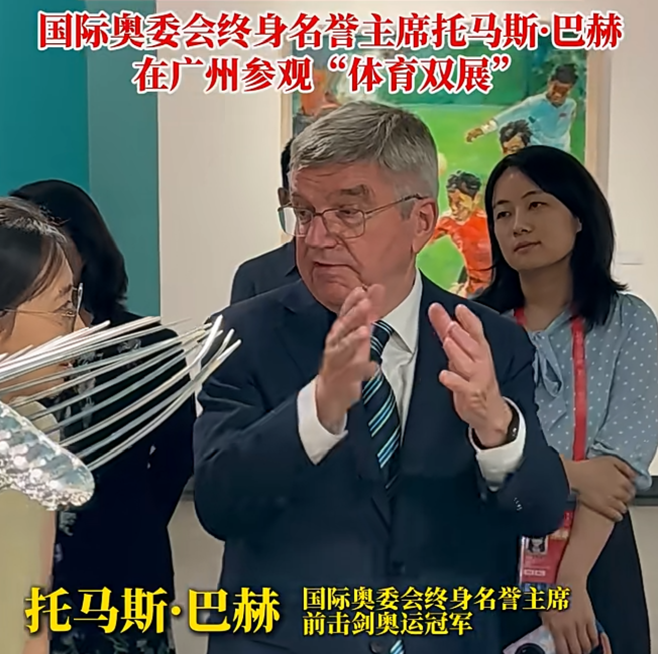 位于广州越秀区的广东美术馆11月10日迎来了一位中国体育的“老朋友”——国际奥委会终身名誉主席巴赫。他来到这里,参观了第十届中国体育美术作品展览和“中华体育精神颂”十五运站中国体育文化展。